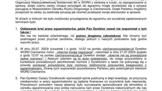 Egzaminatorzy podkreślają również, że Dyrektor WORD Ciechanów wprowadził opinię publiczną w błąd twierdząc, że przyczyną nieobecności w pracy egzaminatorów są żądania finansowe. Prawdziwym powodem ich absencji - jak piszą, było wyczerpanie spowodowane złą atmosferą w ośrodku egzaminowania oraz próba narzucenia im przez Dyrektora niekorzystnych dla nich warunków pracy.
