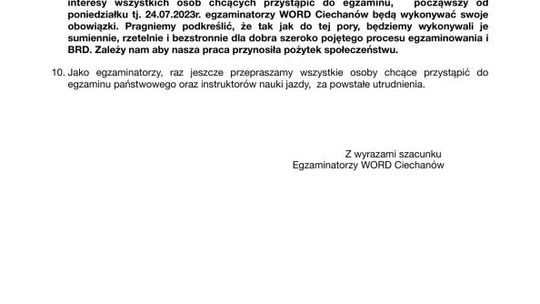Jak wynika z listu, mając na względzie dobro WORD Ciechanów oraz dbając o interesy wszystkich osób chcących przystąpić do egzaminu, egzaminatorzy zadeklarowali, że od poniedziałku tj. 24.07.2023r. będą wykonywać swoje obowiązki. Podkreślają, że tak jak do tej pory, będą wykonywali je sumiennie, rzetelnie i bezstronnie dla dobra szeroko pojętego procesu egzaminowania i BRD.