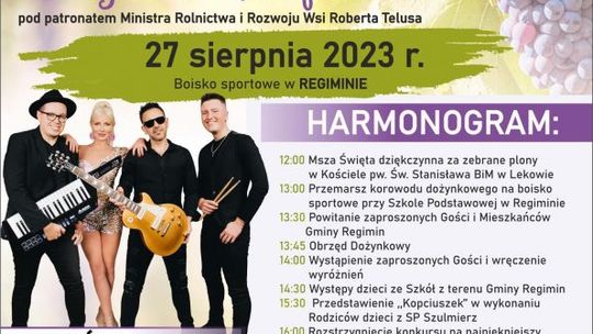 W programie m.in. przemarsz korowodu dożynkowego, rozstrzygnięcie konkursu na najpiękniejszy bukiet dożynkowy, piosenki ludowe w wykonaniu seniorów z Klubu Senior plus w Lekowie, degustacja potraw przygotowanych przez Koła Gospodyń Wiejskich z terenu gminy Regimin. Nie zabraknie atrakcji dla dzieci.