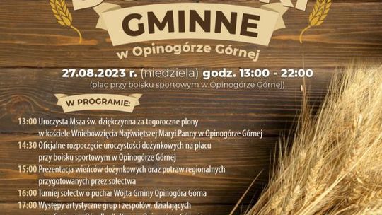 W programie m.in. prezentacja wieńców dożynkowych oraz potraw regionalnych przygotowanych przez sołectwa, występy artystyczne grup i zespołów, działających przy Gminnym Ośrodku Kultury i koncert zespołu SŁOWIANY. Gminne Dożynki w Opinogórze Górnej w niedzielę 27 sierpnia na placu przy boisku sportowym.