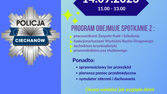 14 września 2023 roku, Komenda Powiatowa Policji w Ciechanowie organizuje Dzień Otwarty, na który serdecznie zaprasza mieszkańców miasta oraz wszystkie osoby zainteresowane służbą w policji. Impreza odbędzie się na Stadionie Miejskim MOSiR w Ciechanowie, w godzinach 11:00 - 13:00.