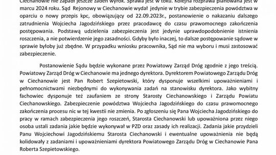 W tej sprawie Starostwo Powiatowe wydało oświadczenie ( zamieściliśmy w galerii), podkreślając brak prawomocnego wyroku oraz zwróciło uwagę na trwające w dalszym ciągu postępowanie. Sąd Rejonowy w Ciechanowie wydał jedynie postanowienie o nakazaniu dalszego zatrudnienia Jagodzińskiego przez pracodawcę do czasu zakończenia postępowania.