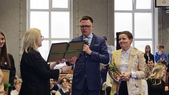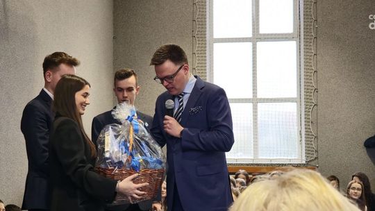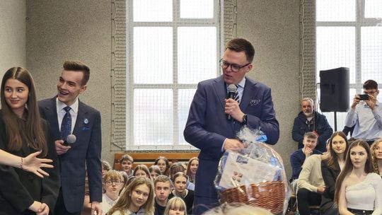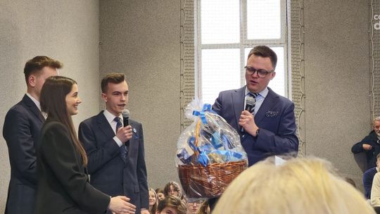 Na koniec wizyty, Marszałek Hołownia otrzymał prezent na pamiątkę od społeczności szkolnej, a szkole podarował pięknie oprawione wydania Konstytucji RP z jego autografem.