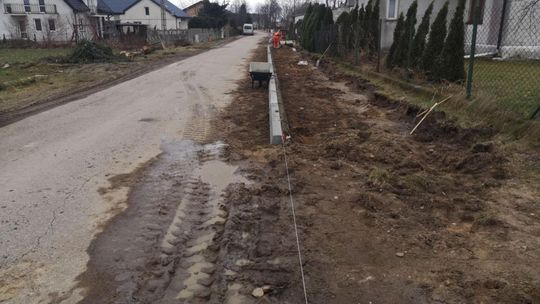 Zaprojektowane jest wykonanie chodników usytuowanych przy jezdni o szer. 2,00 m i długości całkowitej strona prawa 615,34 m, strona lewa 1181,84 m. o nawierzchni betonowej kostki brukowej. Wody opadowe i roztopowe zostaną odprowadzone do następujących odbiorników tj.: