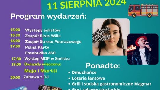 • Rodzinny Piknik Strażacki – Ochotnicza Straż Pożarna w Sońsku zaprasza na plac zielony za OSP w godz. 15:00 – 22:00. Piknik przewiduje liczne koncerty i zabawę z DJem. Główne gwiazdy wieczoru to Maja i Martti. Ponadto dostępne będą różnorodne gry i zabawy dla dzieci.