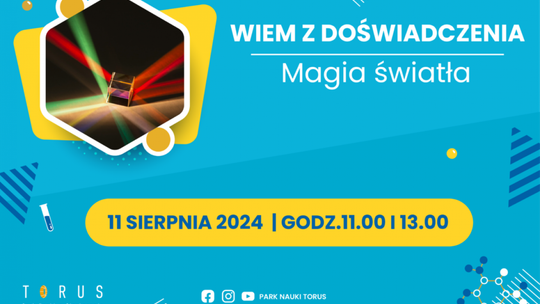 • Weekendowe warsztaty dla dzieci w wieku od 6 lat, w Parku Nauki Torus. W ramach cyklu „Wiem z doświadczenia” uczestnicy poznają zagadnienia dotyczące światła, przeprowadzą eksperymenty z panelami fotowoltaicznymi oraz skonstruują proste obwody elektryczne zasilane energią słoneczną. Zajęcia poprowadzi Marcin Kamiński o godz. 11:00 i 13:00. Zapisy pod nr tel. 23 674 93 13