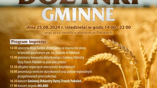 • Dożynki Gminne rozpoczną się o godz. 14:00 mszą świętą dziękczynną za tegoroczne plony w kościele parafialnym pw. św. Gotarda w Pałukach. Na godz. 20:00 przewidziana jest zabawa taneczna, którą poprowadzi DJ BLACK