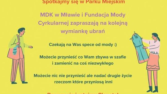 • Fundacja Mody Cyrkularnej i Miejski Dom Kultury w Mławie organizują wielką wymianę ubrań. Start godz. 16:00 w Parku Miejskim. Wymiana jest całkowicie bezpłatna.