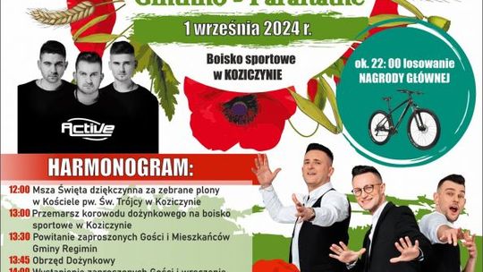 • Dożynki Gminno-Parafialne - na boisku sportowym będą czekać na Was liczne atrakcje. O godz. 19:30 koncert zagra Grupa Active, a następnie o 20:30 na scenie wystąpi zespół Playboys. Na koniec przewidziana jest zabawa taneczna z DJ-em do późnych godzin. Szczegółowy harmonogram dostępny jest na plakacie.