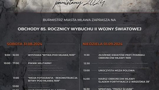 • 85 rocznica wybuchu II Wojny Światowej - co roku Mława przygotowuje wydarzenie upamiętniające kolejną rocznicę. W programie pokaz sprzętu wojskowego, wystawy, koncerty, spektakle oraz maraton filmowy i kino sferyczne. O godz. 17:00, w parku miejskim odbędzie się koncert Reprezentacyjnego Zespołu Artystycznego Wojska Polskiego. Jednak to nie wszystkie atrakcje. Więcej szczegółów dostępnych na plakacie.