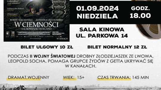 • Weekendowe kino w ramach 85. rocznicy wybuchu II Wojny Światowej – seans filmu „W Ciemności” – podczas II Wojny Światowej drobny złodziejaszek ze Lwowa, Leopold Socha, pomaga grupce Żydów z getta ukrywać się w kanałach. Start godz. 18:00 w sali kinowej, ul. Parkowa 14.