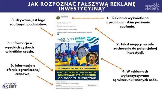 - Fałszywe inwestycje - znana osoba w fałszywym wideo zachęca do inwestycji, obiecując ogromne zyski. Nie daj się nabrać, to oszustwo.
