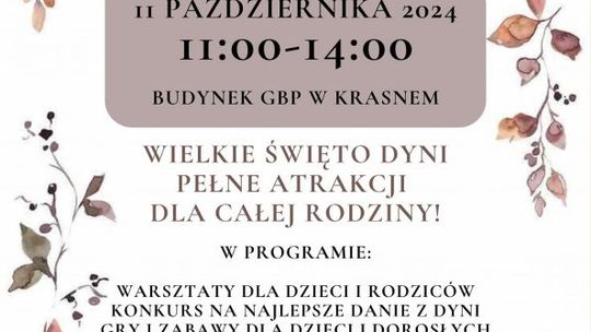 DYNIOWY PIKNIK - Budynek GBP w Krasnem - godz. 11:00 - 14:00. Tego dnia czekać na Was będzie moc atrakcji: Warsztaty dla dzieci i rodziców, konkurs na najlepsze danie z dyni, gry i zabawy dla dzieci i dorosłych, pokaz kulinarny, fotobudka dyniowa i wiele więcej!