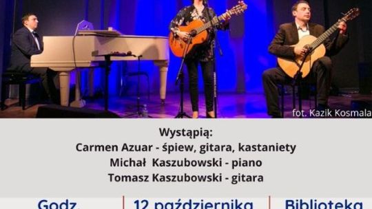 Miejska Biblioteka Publiczna im. Zofii Nałkowskiej zaprasza o godz. 19:00 na koncert piosenki latynoamerykańskiej i hiszpańskiej w wykonaniu Carmen Azuar oraz Michała i Tomasza Kaszybowskich.