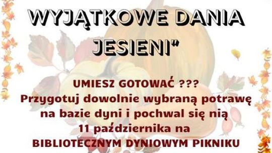Konkurs Kulinarny z Nagrodami - Gminna Biblioteka Publiczna zaprasza wszystkich, także przedstawicieli Kół Gospodyń Wiejskich z terenu naszej Gminy. "Dynia Chef: Wyjątkowe Dania Jesieni". Pochwal się swoim wyjątkowym daniem z dyni! Konkurs w ramach Gminnego Programu Profilaktyki i Rozwiązywania Problemów Alkoholowych i Przeciwdziałania Narkomanii na lata 2024-2027.