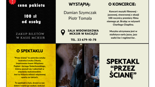 MCKSiR w Raciążu organizuje serię warsztatów i wydarzeń kulturalnych, w tym warsztaty muzyczne „Mazowsze Północne – ziemia nieznana” poświęcone tradycyjnym pieśniom weselnym (10.10.2024), darmowe zajęcia dla dorosłych na temat nowoczesnych metod rolnictwa i dobrostanu zwierząt (16.10.2024), seans filmu „Chłopi” z wystawą (18.10.2024) oraz Piknik Ekologiczny połączony z Akademią Dobrej Mody (22.10.2024).