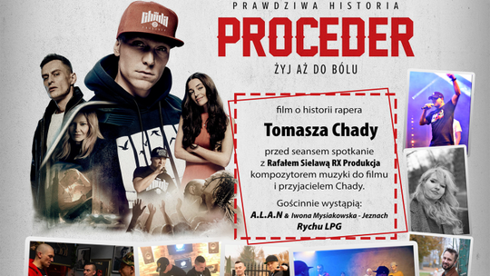 Miejskie Centrum Kultury, Sportu i Rekreacji zaprasza na film o historii rapera Tomasza Chady "Proceder". Przed seansem odbędzie się spotkanie z Rafałem Sielawą RX Produkcja, kompozytorem muzyki do filmu i przyjacielem Chady. Gościnnie wystąpią ALAN z Iwoną Mysiakowską-Jeznach i Rychu LPG. Początek wydarzenia o godz. 18:00. Bilety na seans filmu dostępne są w sekretariacie MCKSiR i przed seansem.