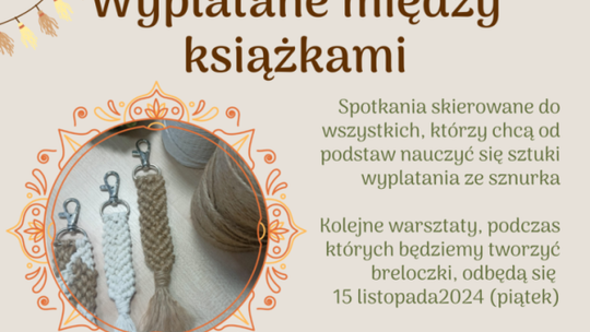 W Miejskiej Bibliotece Publicznej, w godz. 16:00 - 17:00, odbędą się kolejne warsztaty z cyklu „Wyplatane między książkami”. Podczas najbliższego spotkania uczestnicy wykonają breloczki – idealne do kluczy lub jako wyjątkowy dodatek do torby czy plecaka. Każdy uczestnik wyjdzie z własnoręcznie wykonanym dziełem, które będzie nie tylko piękną pamiątką, ale i dowodem na to, że ze zwykłego sznurka można stworzyć coś wyjątkowego! Zapisy: 23 673 26 30.