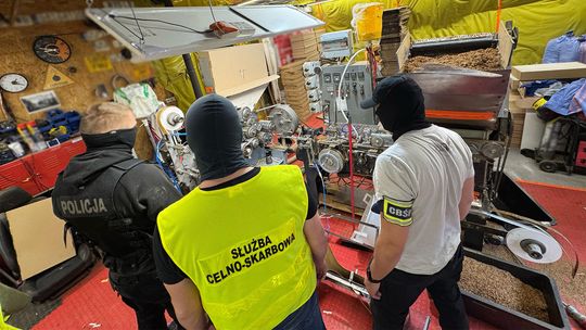 W pomieszczeniu gospodarczym odnaleziono kompletną, w pełni działającą linię technologiczną do produkcji papierosów. To nie był zwykły magazyn, lecz profesjonalnie zorganizowana fabryka, gdzie gotowe wyroby były już pakowane w opakowania typu pizza, przygotowane do natychmiastowego transportu.
