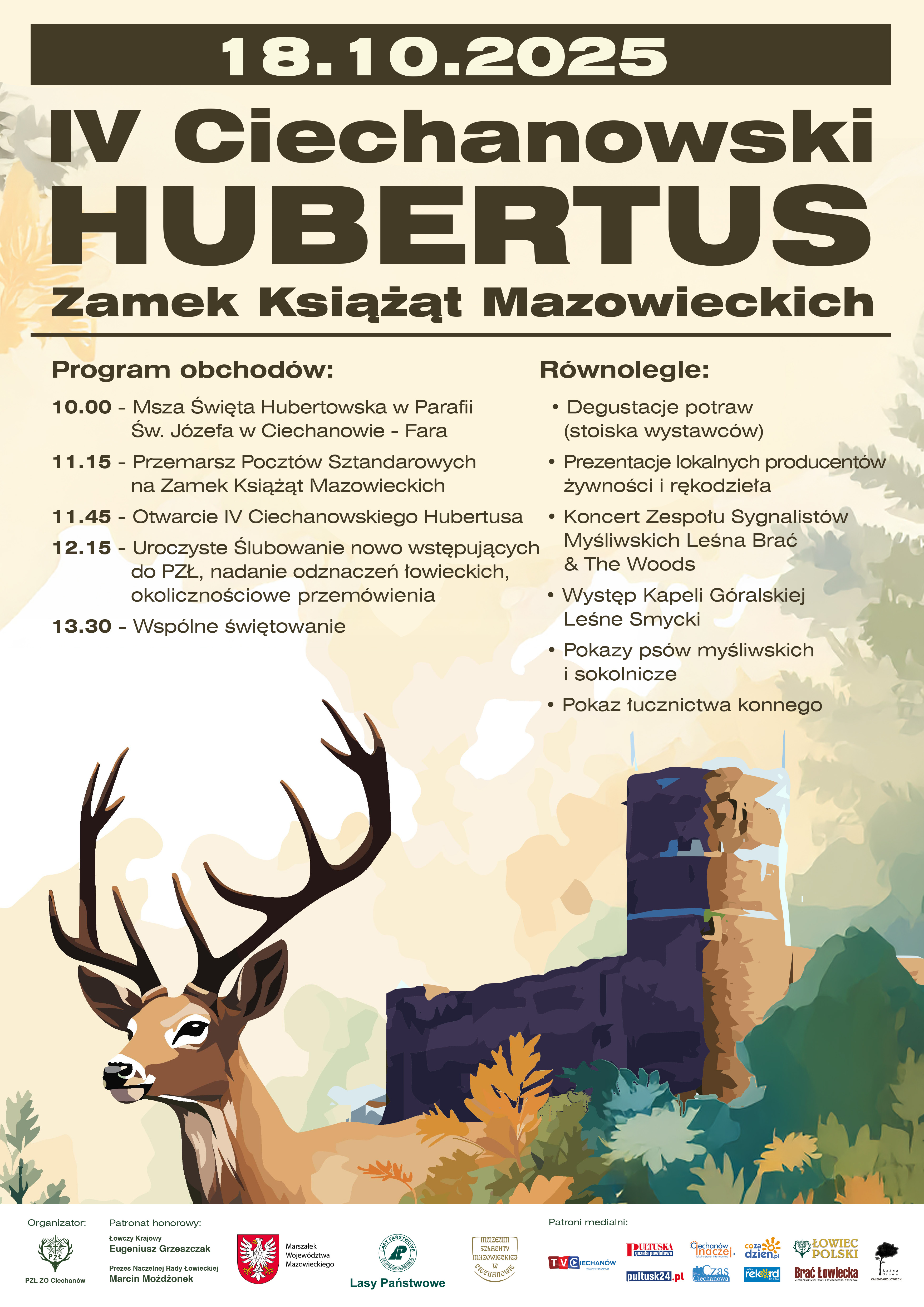 Tegoroczne obchody, organizowane przez Polski Związek Łowiecki w Ciechanowie , rozpoczną się o godzinie 10:00 Mszą Świętą Hubertowską w ciechanowskiej Farze (Parafia św. Józefa). Tuż po nabożeństwie, o godzinie 11:15, ulicami miasta na Zamek Książąt Mazowieckich przejdzie uroczysty przemarsz pocztów sztandarowych.