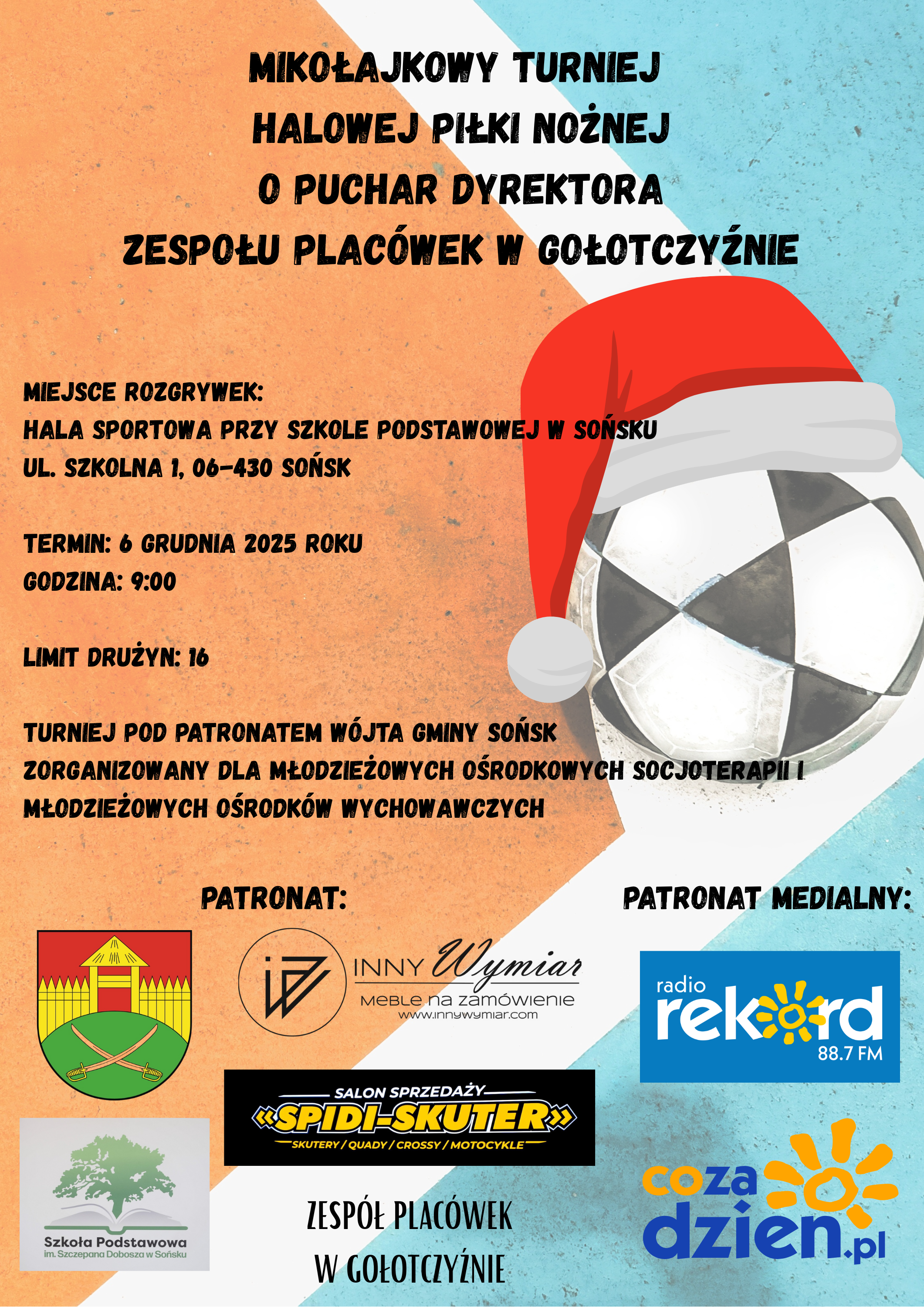 Mikołajkowy Turniej rozpocznie się 6 grudnia o godzinie 9:00 w Hali Sportowej przy ul. Szkolnej 1 w Sońsku. Patronat medialny nad wydarzeniem objęły Radio Rekord 88.7 FM oraz portal cozadzien.pl.