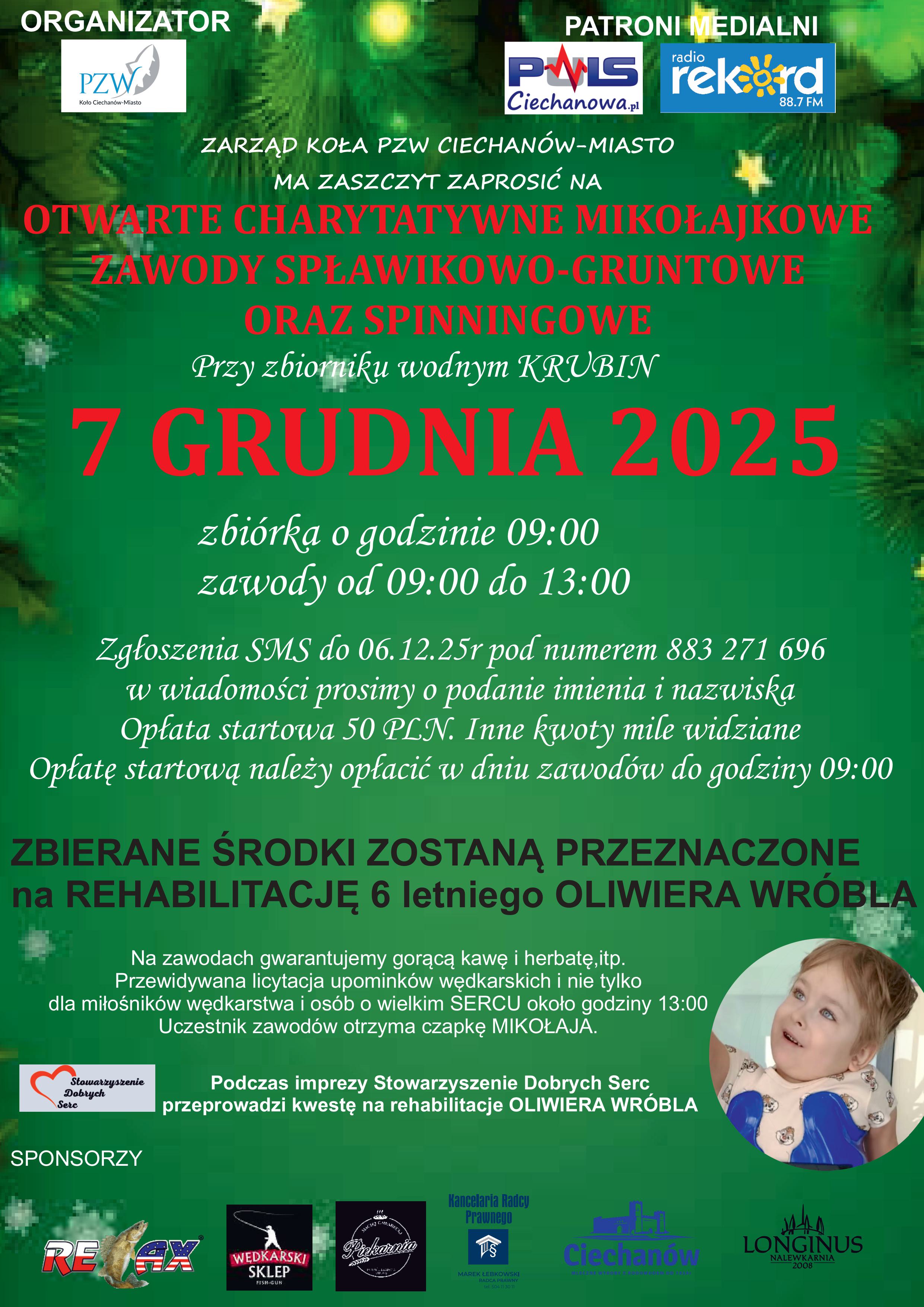 Na szczęście, Oliwier ma wokół siebie ludzi o wielkich sercach. Zarząd Koła PZW Ciechanów-Miasto organizuje Otwarte Charytatywne Mikołajkowe Zawody Spławikowo-Gruntowe oraz Spinningowe.
