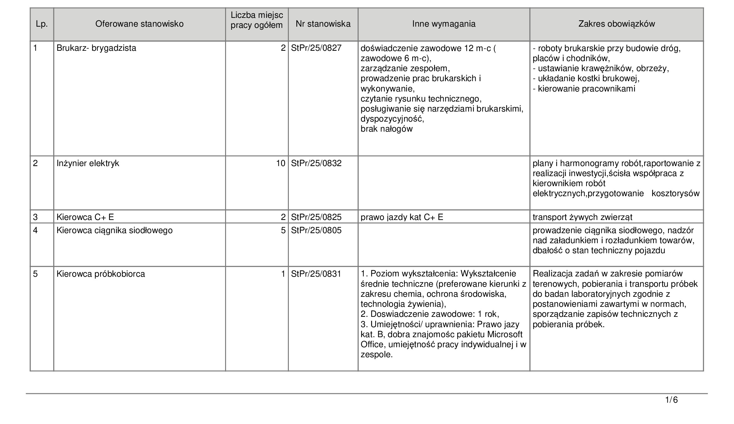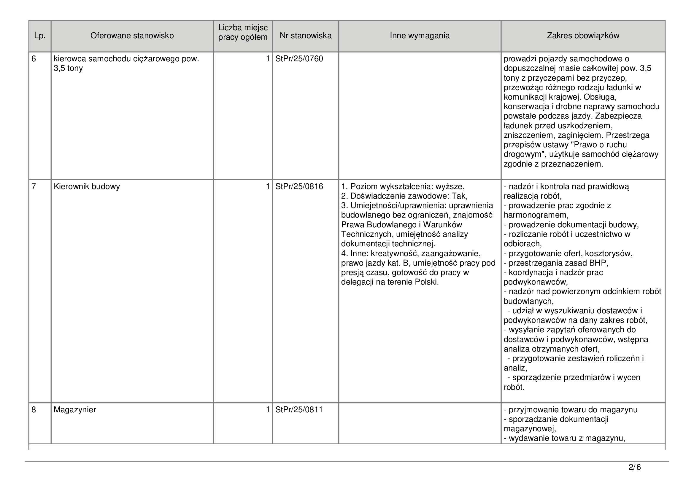 Poszukiwani są pracownicy produkcji (8 miejsc) oraz Brukarze-brygadziści (2 miejsca), od których wymaga się co najmniej 12 miesięcy doświadczenia i umiejętności czytania rysunku technicznego. Duże zapotrzebowanie jest również na stanowiska w sektorze budowlanym – m.in. Robotnik budowlany i Kierownik budowy. Od tego drugiego wymaga się wykształcenia wyższego, uprawnień budowlanych oraz znajomości Prawa Budowlanego i Warunków Technicznych.