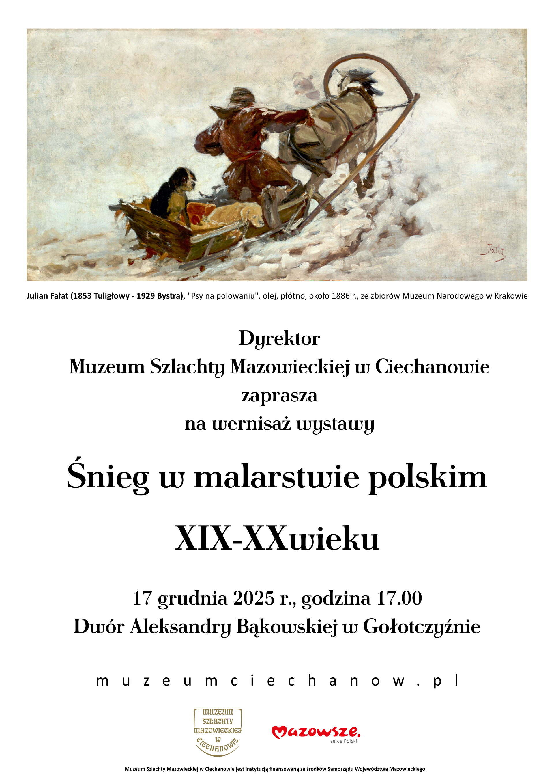 Wydarzenie odbędzie się w nastrojowych wnętrzach Dworu Aleksandry Bąkowskiej w Gołotczyźnie o godzinie 17:00. To właśnie tam zagości wystawa czasowa „Śnieg w malarstwie polskim XIX–XX wieku”. Nie jest to jedynie przegląd pejzaży. Ekspozycja została pomyślana jako podróż przez style i epoki, pokazująca, jak zmieniało się postrzeganie zimy przez artystów.
