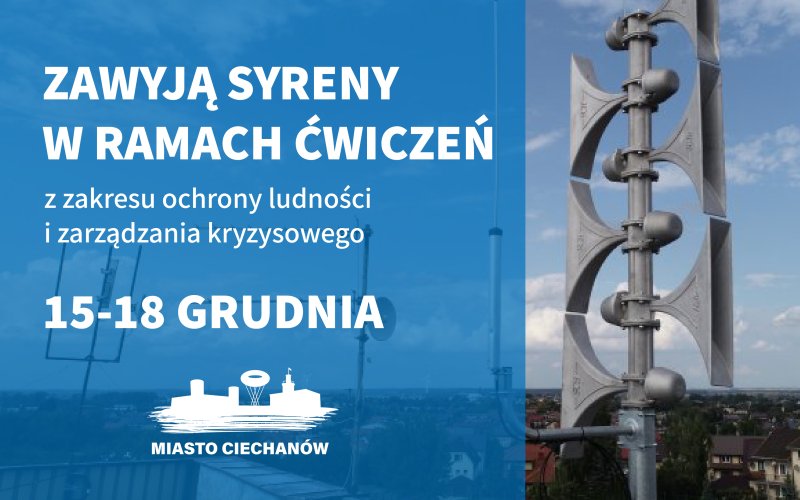 Wydział Bezpieczeństwa i Zarządzania Kryzysowego informuje, że między 15 a 18 grudnia na terenie całego województwa mazowieckiego, w tym również w Ciechanowie, przeprowadzone zostaną ćwiczenia pod kryptonimem "Syrena-25". W tych dniach, w przedziale godzinowym od 08:00 do 15:00, mogą zostać uruchomione systemy alarmowania i ostrzegania ludności.
