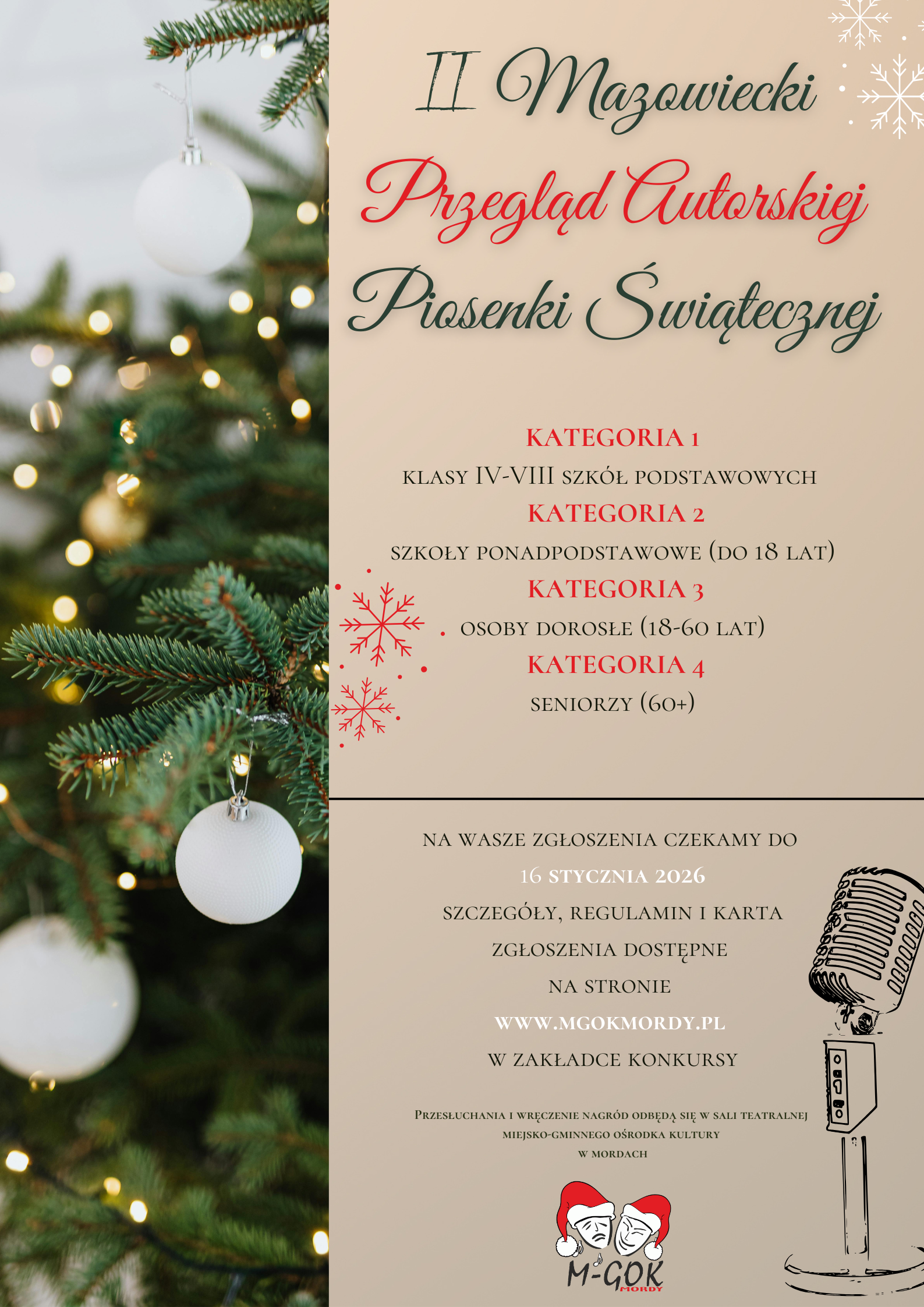 Przesłuchania konkursowe odbędą się 24 stycznia. Całe wydarzenie rozpocznie się o godzinie 10:00 w sali teatralnej Miejsko-Gminnego Ośrodka Kultury w Mordach, które jest głównym organizatorem.