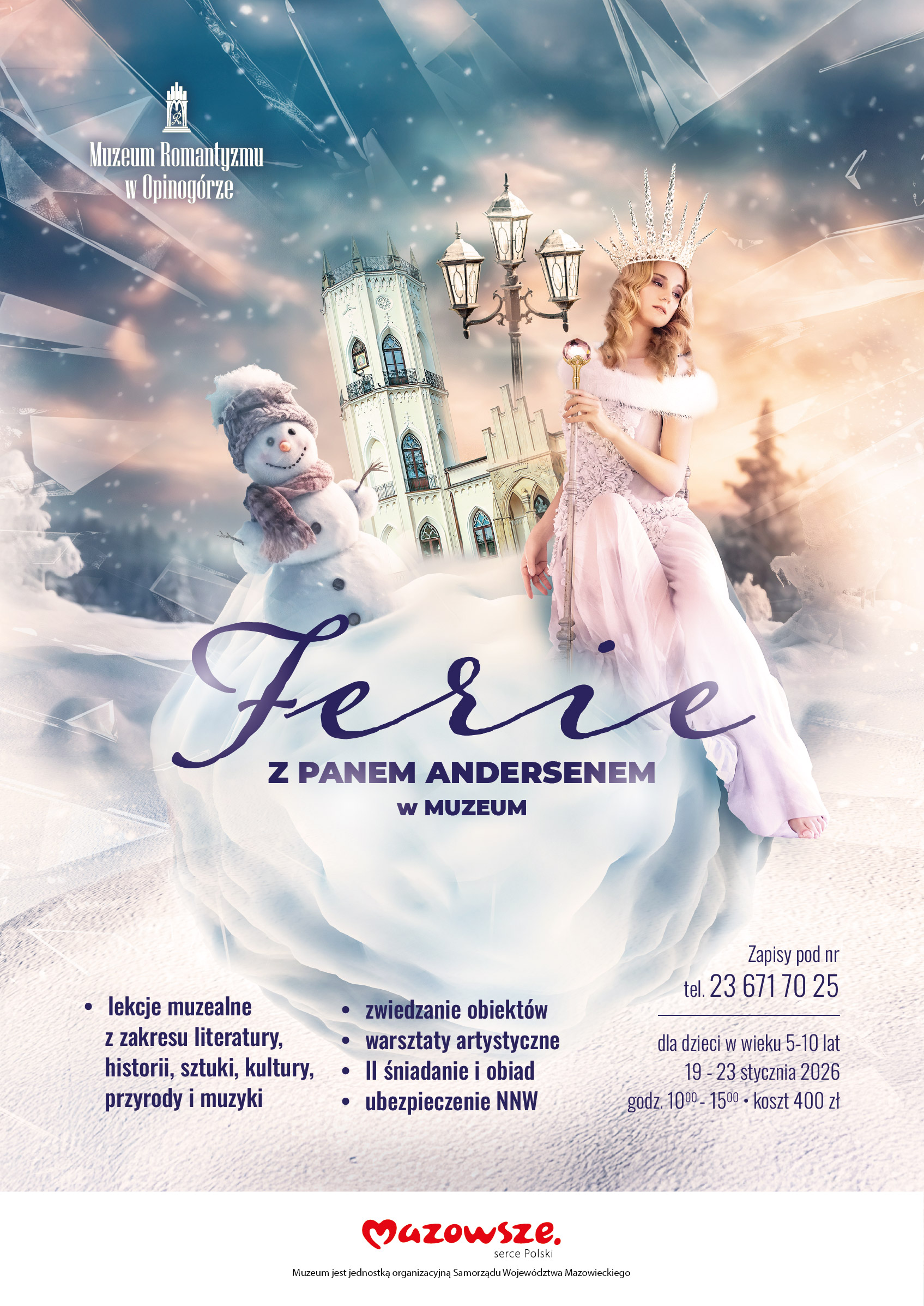 Przygotowany program „Ferie z Panem Andersenem w Muzeum” łączy w sobie elementy lekcji muzealnych z aktywnością warsztatową. Uczestnicy będą zgłębiać tematy z zakresu literatury, historii, sztuki, a także przyrody i muzyki. Ważnym punktem każdego dnia będzie zwiedzanie zabytkowych obiektów opinogórskiego zespołu pałacowo-parkowego.