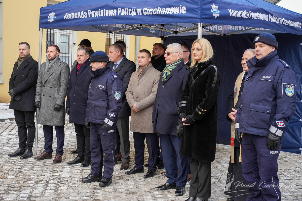 Uroczystość rozpoczął Komendant Powiatowy Policji w Ciechanowie podinsp. Łukasz Jędrasik, który w swoim wystąpieniu podziękował samorządowcom za nieustające wsparcie i dobrą współpracę na rzecz bezpieczeństwa mieszkańców powiatu ciechanowskiego, dzięki której możliwy był zakup 6 nowych pojazdów.