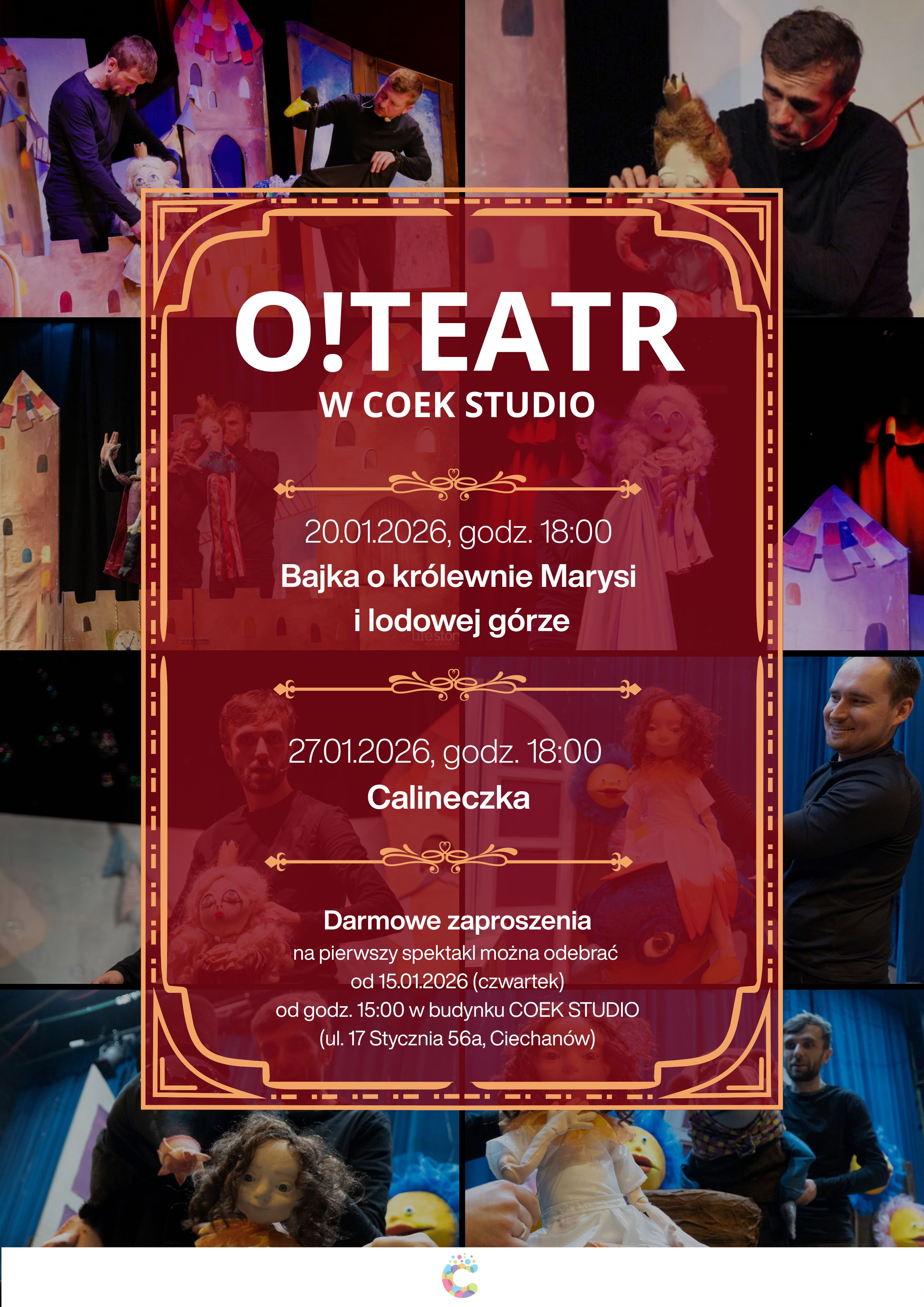 Darmowe zaproszenia na pierwszy spektakl (20 stycznia) będą wydawane od 15 stycznia (czwartek) od godziny 15:00. Można je odebrać osobiście w budynku COEK STUDIO przy ul. 17 Stycznia 56a w Ciechanowie. Warto pamiętać, że liczba miejsc jest ograniczona, a wejściówki zazwyczaj rozchodzą się bardzo szybko.