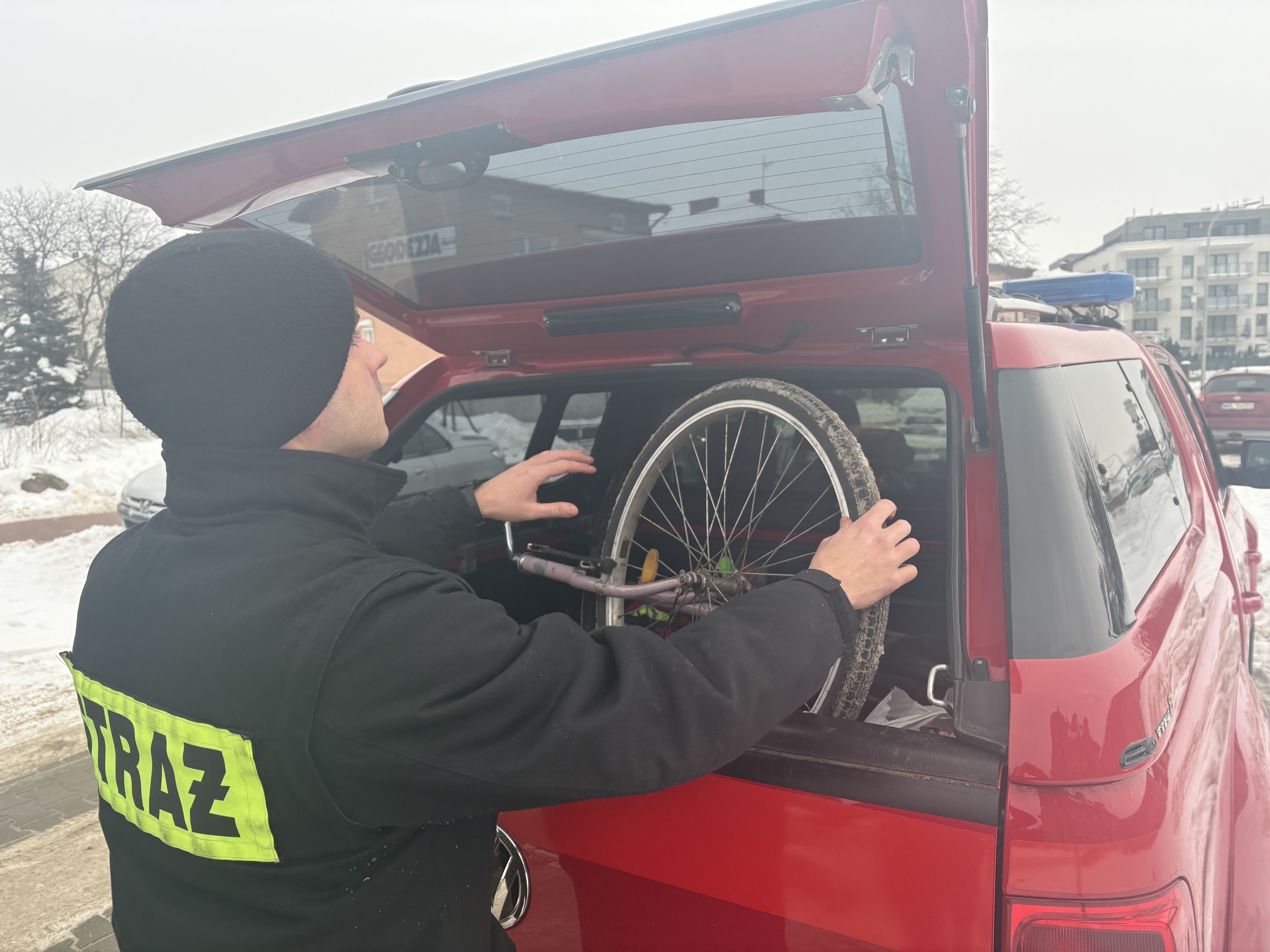 Mundurowi zaprosili seniorkę do radiowozu, gdzie mogła się ogrzać. W pomoc zaangażował się również strażak z Państwowej Straży Pożarnej w Mławie, który pomógł przetransportować rower i zapasy pod same drzwi mieszkania kobiety. Dzięki sprawnej współpracy służb, mieszkanka Mławy bezpiecznie wróciła do domu.