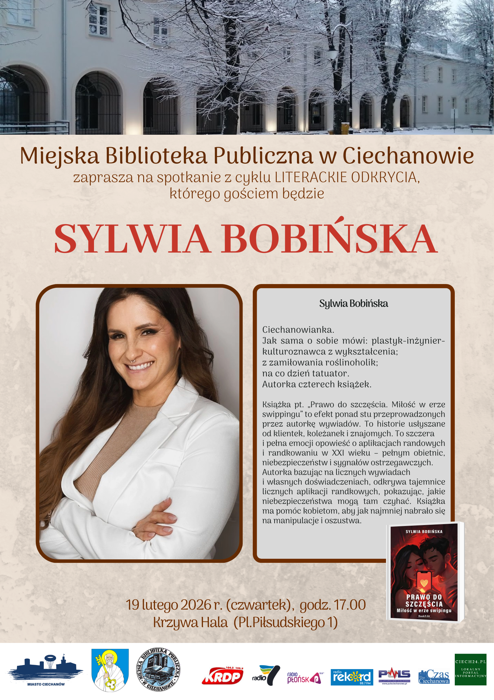 Spotkanie odbędzie się 19 lutego 2026 roku o godzinie 17.00 w Krzywej Hali przy Placu Piłsudskiego 1. Jest to kolejna odsłona popularnego cyklu "Literackie Odkrycia", promującego lokalnych twórców i ważne tematy społeczne.