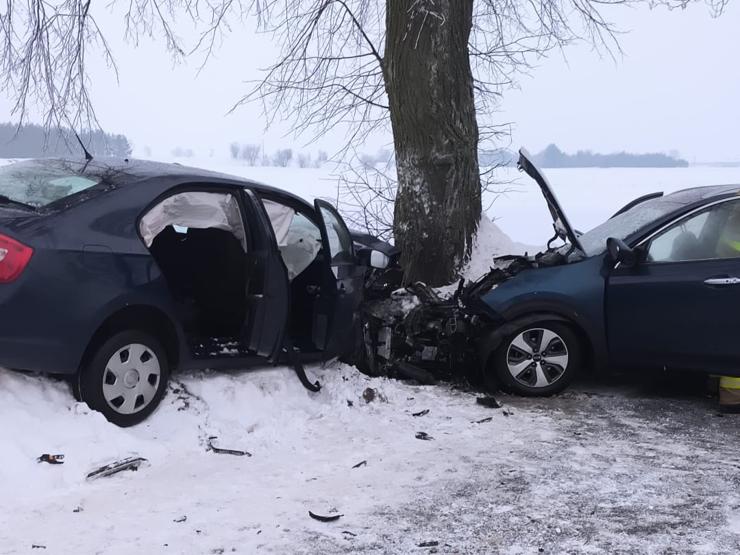 Dwie osoby trafiły do szpitala po tym, jak na śliskiej nawierzchni doszło do czołowego zderzenia dwóch samochodów osobowych. Policja wyjaśnia okoliczności zdarzenia i ostrzega: warunki do jazdy są bardzo trudne.