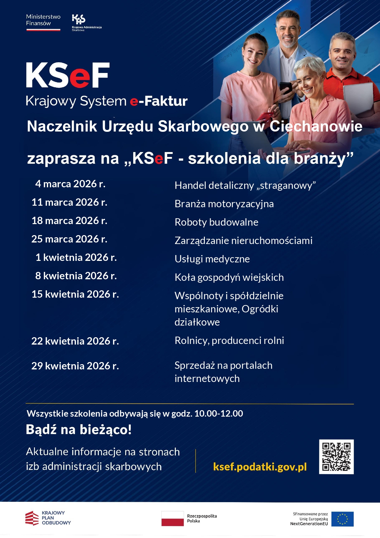 Urząd Skarbowy w Ciechanowie zaprasza na szkolenia branżowe, związane z wdrożeniem Krajowego Systemu e-faktur. Podczas szkoleń zostanie przekazana podstawowa wiedza dotycząca KSeF.