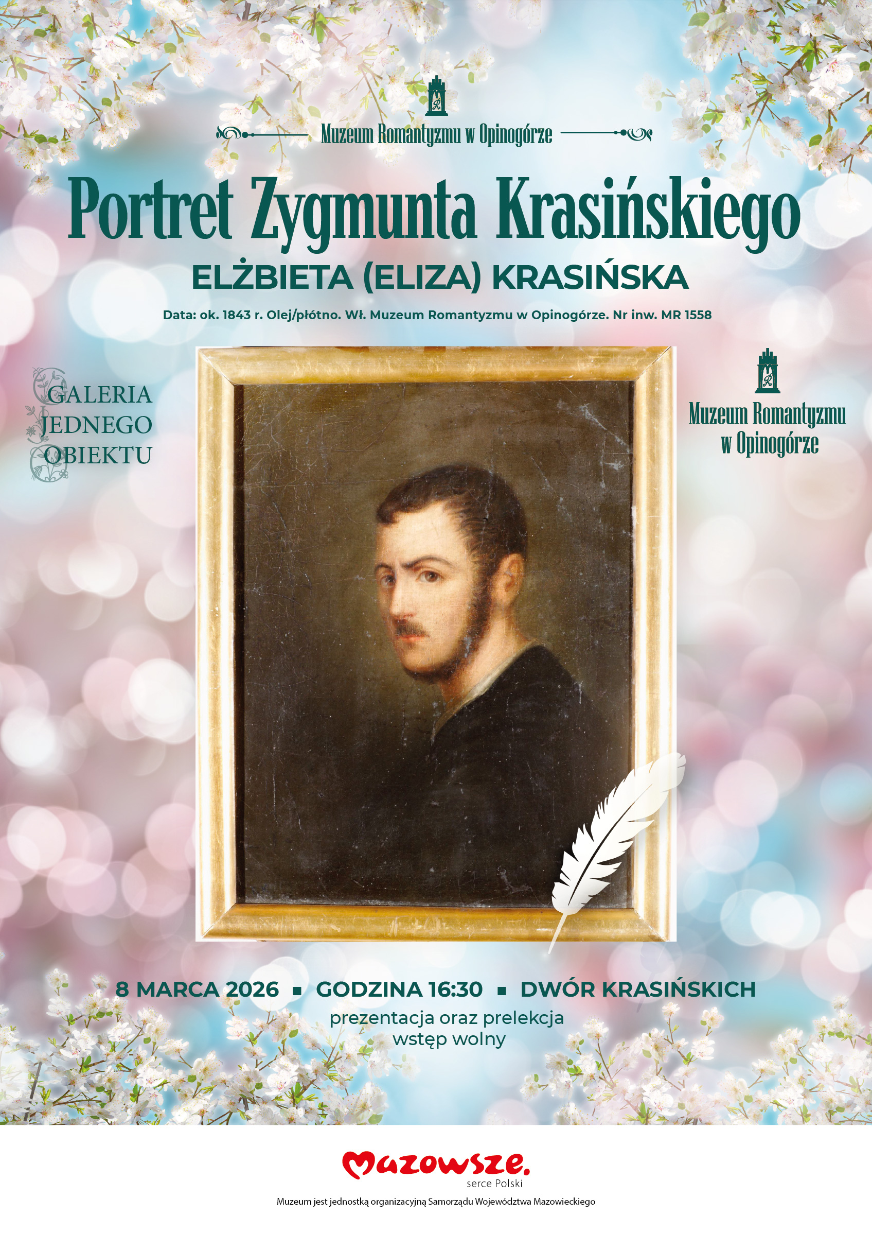 Program niedzieli w Muzeum Romantyzmu jest bogatszy. O godz. 16:30 w Dworze odbędzie się prezentacja w ramach cyklicznych spotkań Galerii Jednego Obiektu - tym razem poświęcona Portretowi Zygmunta Krasińskiego z około 1843 roku. Autorem obrazu jest Elżbieta z Branickich Krasińska - żona wieszcza. Dzieło jest własnością Muzeum Romantyzmu w Opinogórze.