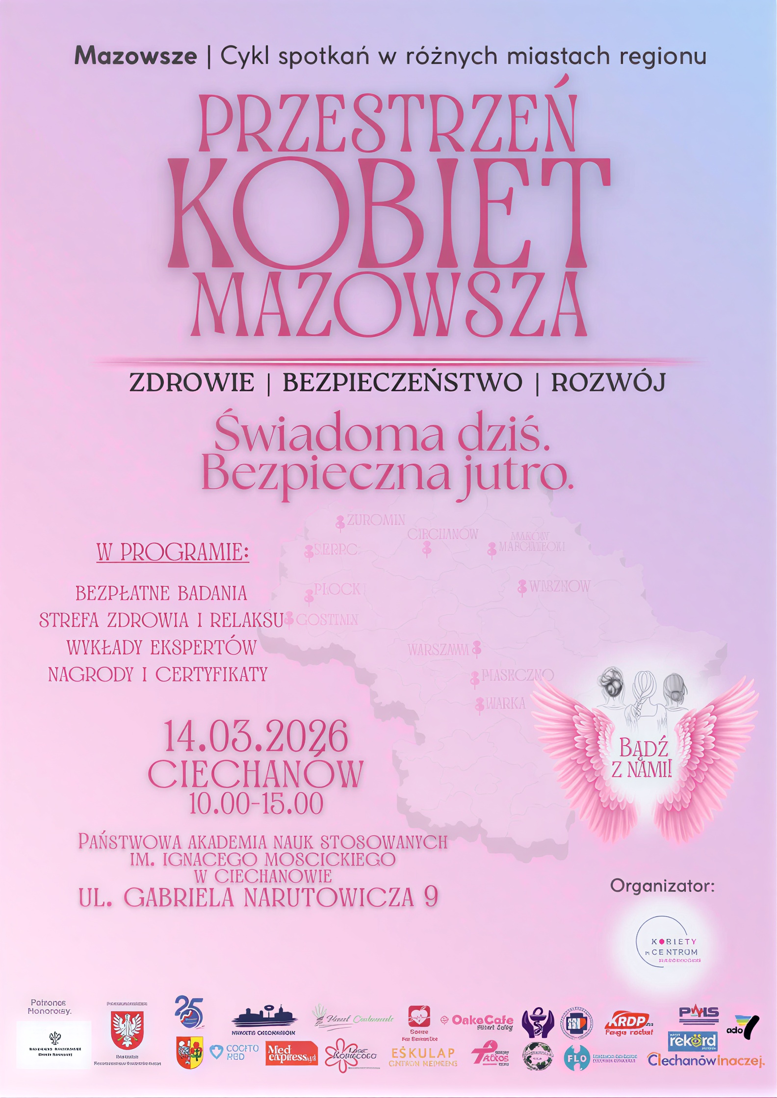 Wydarzenie organizowane przez Stowarzyszenie Kobiety w Centrum Region Mazowiecki - Ciechanów odbędzie się w Państwowej Akademii Nauk Stosowanych im. Ignacego Mościckiego przy ul. Gabriela Narutowicza 9. Godziny: 10:00-15:00.