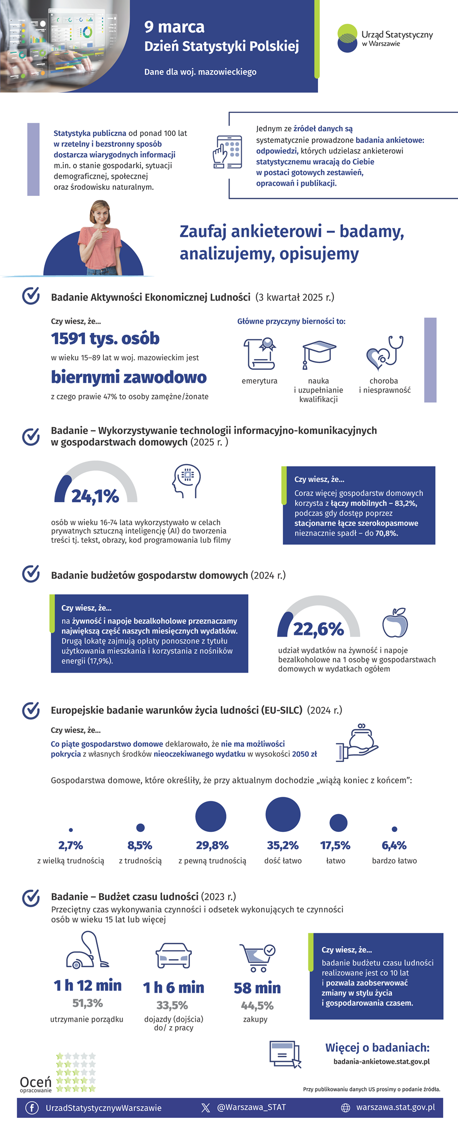 Polska statystyka publiczna od ponad 100 lat w rzetelny i bezstronny sposób dostarcza wiarygodnych informacji, a jednym z podstawowych źródeł danych (obok sprawozdawczości) są systematycznie prowadzone badania ankietowe. Dzięki odpowiedziom udzielanym przez mieszkańców Mazowsza wiemy na przykład, że sztuczną inteligencję wykorzystywała w celach prywatnych co czwarta osoba w wieku 16-74 lata.
