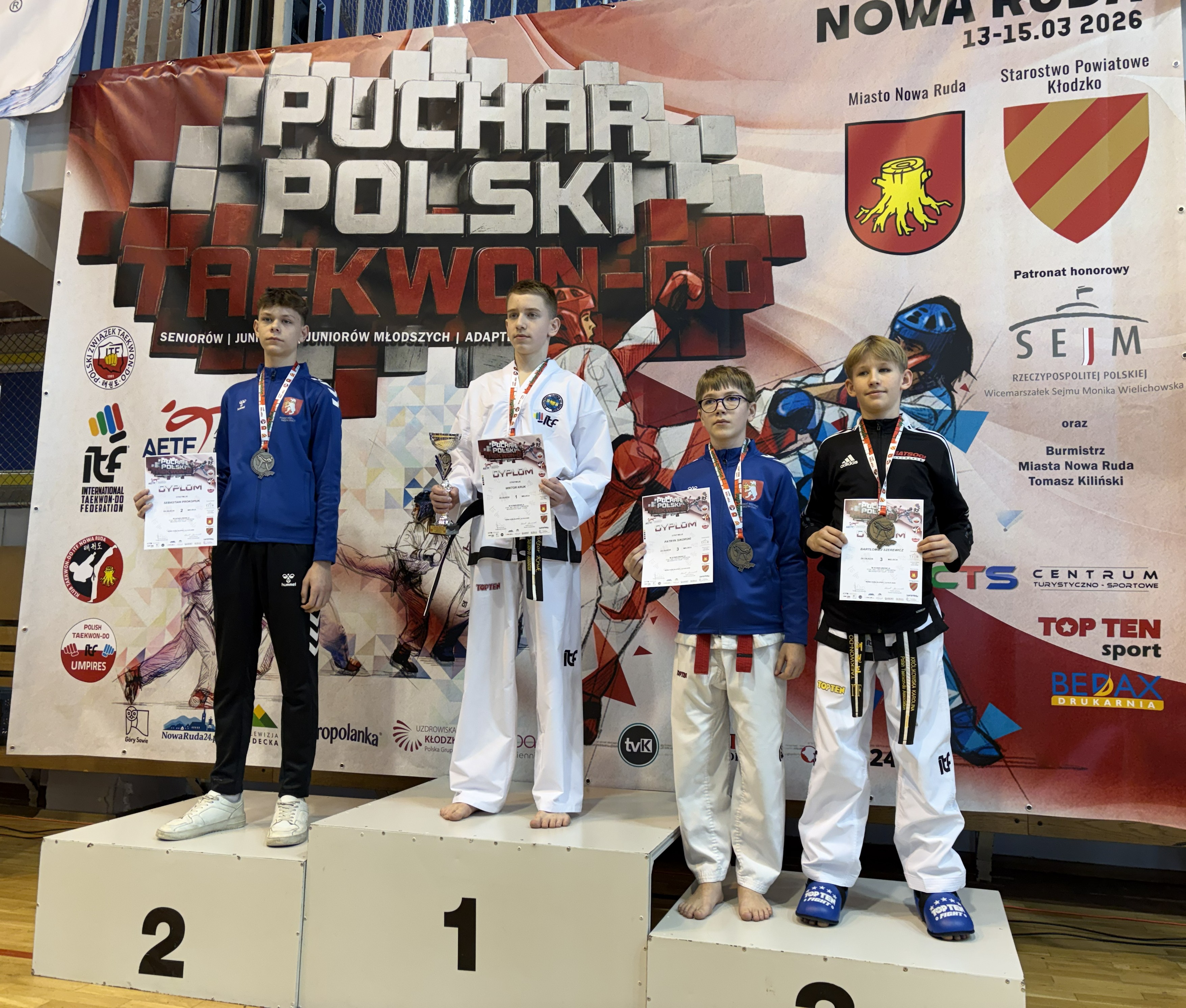 Z bardzo dobrej strony pokazał się również Bartłomiej Szerewicz, zdobywając srebro w walkach do 45 kg. W tej kategorii dopiero w finale musiał uznać wyższość zawodnika z Wrocławia. Swój drugi krążek, tym razem brązowy, Bartek dołożył w konkurencji układów formalnych 1 gup - I dan. Dobra forma obu zawodników nie umknęła uwadze selekcjonerów. "Obydwaj nasi zawodnicy otrzymali powołanie do Reprezentacji Polski na kwietniowe Mistrzostwa Europy, które odbędą się w Mariborze na Słowenii" - dodaje trener Korzybski.