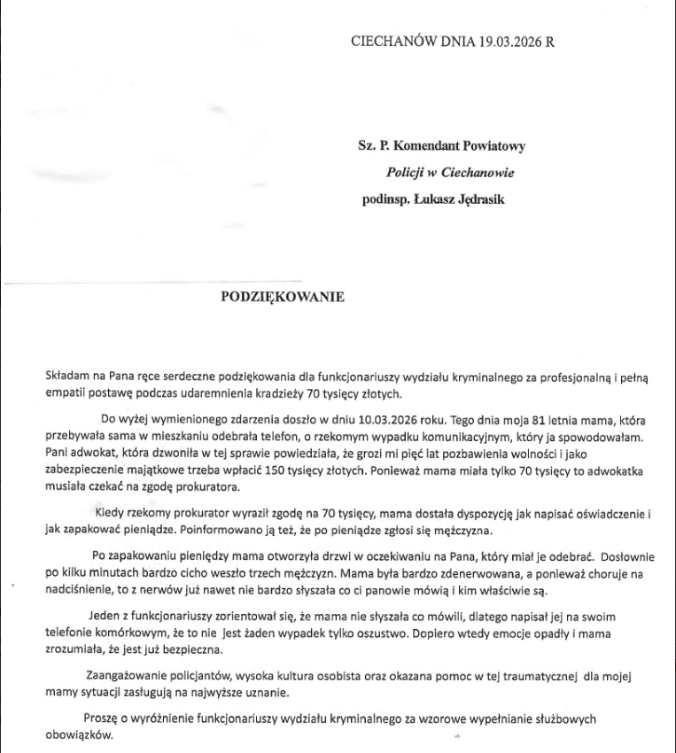 W skierowanym do Komendanta piśmie córka seniorki podkreśliła nie tylko skuteczność działań funkcjonariuszy, ale także ich wysoką kulturę osobistą, zaangażowanie oraz wsparcie okazane pokrzywdzonej w trudnej i stresującej sytuacji.