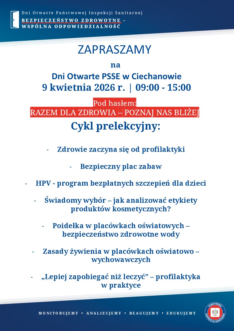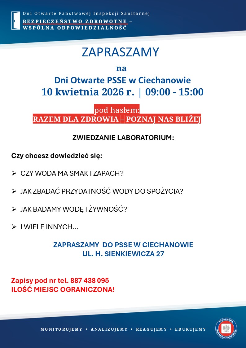 Państwowa Inspekcja Sanitarna otwiera swoje drzwi dla mieszkańców. Już 9 i 10 kwietnia, w godzinach 09:00 – 15:00, w siedzibie PSSE w Ciechanowie odbędą się Dni Otwarte pod hasłem: „Razem dla zdrowia – poznaj nas bliżej”. To wyjątkowa okazja, aby dowiedzieć się, jak na co dzień dbać o bezpieczeństwo zdrowotne swoje i swojej rodziny.