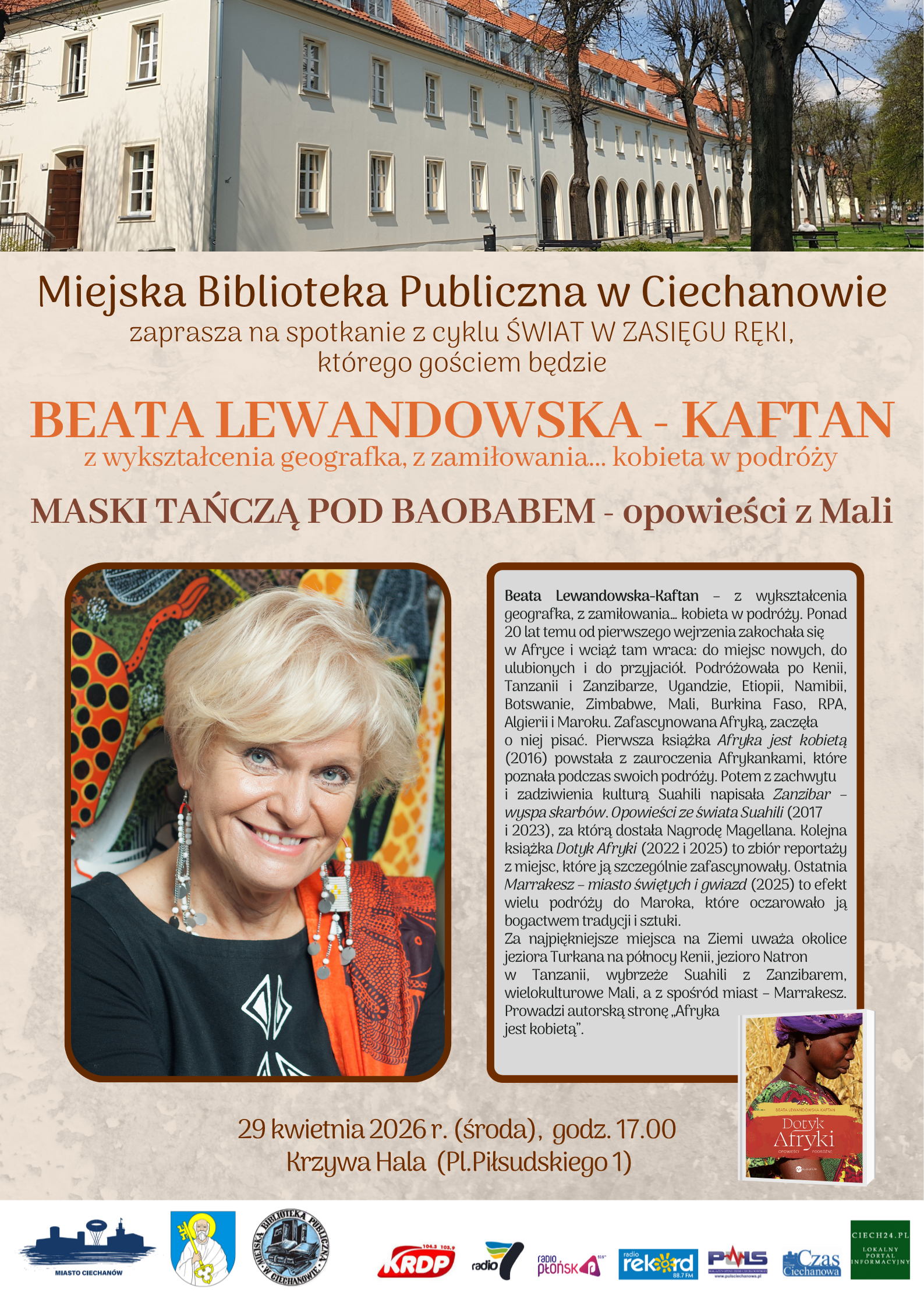 Miejska Biblioteka Publiczna w Ciechanowie zaprasza na wyjątkowe wydarzenie, które odbędzie się 29 kwietnia 2026 r. o godz. 17.00. W przestrzeni Krzywej Hali przy Placu Piłsudskiego 1, Beata Lewandowska-Kaftan - geografka z wykształcenia i podróżniczka z powołania - podzieli się swoimi doświadczeniami z wypraw do Mali.
