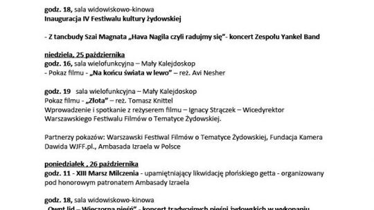 To będą solidnie przygotowane 4 dni poświęcone kulturze żydowskiej. Wydarzenie rozpoczyna się w sobotę 24 października. Pierwszego dnia będą wykłady o wpływie religii na współczesny Izrael, a także o Ben Gurionie i izraelskiej dyplomacji. Na sam koniec dnia oficialne rozpoczęcie festiwalu i koncert zespołu Yankiel band. - Nasz Festiwal Kultury Żydowskiej jest tak skonstruowany, że nie jest poświęcony tylko temu, co nam Polakom kojarzy się z Żydami, a więc ich tragiczny los w trakcie II Wojny Światowej i Holokaust. Chodzi nam o to aby przywracać, w szerokim spektrum kulturę żydowską, jeżeli chodzi o muzykę, sztukę, historię- powiedział nam Filip Przedpełski, rzecznik prasowy Urzędu Miasta Płońsk. Nie zabraknie również filmów o żydowskich imigrantach i o gettcie warszawskim. Jak co roku odbędzie się Marsz Milczenia upamiętniający likwidację płońskiego getta. Festiwalowi będzie towarzyszyła wystawa fotografii na terenie Płońskiego MCKu, a także spektakl Sławomira Hollanda. Program festiwalu znajdziecie poniżej.