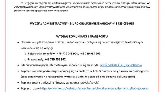 Pełną treść komunikatu w sprawie ograniczenia bezpośredniej obsługi interesantów Starostwa Powiatowego w Ciechanowie publikujemy poniżej.
