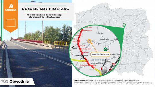 - To nowe zadanie, którego proces inwestycyjny dopiero się rozpoczyna. Wykonane Studium techniczno-ekonomiczno-środowiskowe wraz z elementami koncepcji programowej oraz materiałami do uzyskania decyzji środowiskowej wskażą wariantowy przebieg obwodnicy Ciechanowa. Zakładamy, że powstanie ona w nowym śladzie drogi krajowej nr 60 po południowej stronie miejscowości. Docelowy przebieg trasy klasy GP (głównej ruchu przyspieszonego) zostanie jednak określony w decyzji środowiskowej - informuje GDDKiA Warszawa.