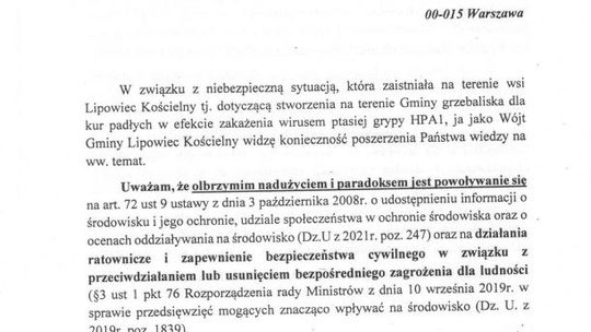 Nie możemy brać odpowiedzialności za innych- tak pomysł stworzenia w Lipowcu Kościelnym grzebowiska dla padłego w wyniku ptasiej grypy drobiu skomentował w Porannej Rozmowie Radia Rekord wójt gminy Jarosław Goschorski. Wójt pisze petycje, a mieszkańcy całodobowo blokują dojazd do miejsca planowanego grzebowiska.