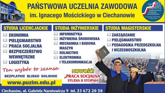 Od kilku miesięcy prezentujemy najciekawsze, naszym zdaniem, szkoły i uczelnie, które młodzieży z północnego Mazowsza mogą dać dobry start w przyszłość. Na antenie Radia Rekord 88,7 FM (którego można słuchać TUTAJ) systematycznie mówimy o tym, co dzieje się na "Puzimie" czyli Państwowej Uczelni Zawodowej im. Ignacego Mościckiego w Ciechanowie (do zobaczenia TUTAJ i TUTAJ). I na najświeższe wiadomości z rodzimej Alma Mater zapraszamy dzisiaj.