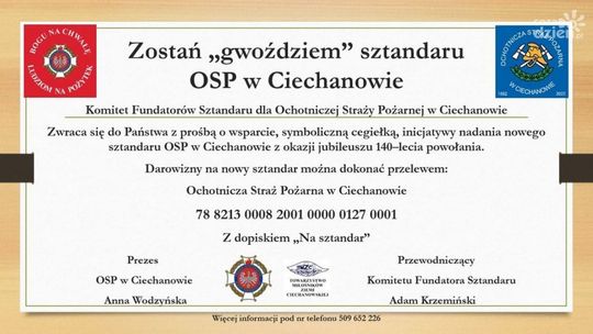 W związku z jubileuszem Ochotnicza Straż Pożarna w Ciechanowie zwróciła się z apelem o wsparcie inicjatywy nadania nowego sztandaru jednostce. Każdy może dołożyć swoją cegiełkę i zostać sztandarowym "gwoździem".